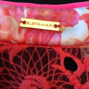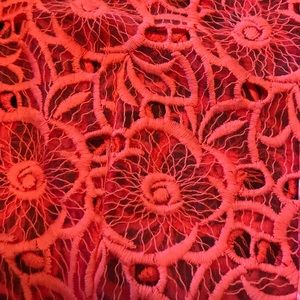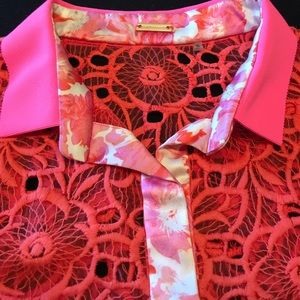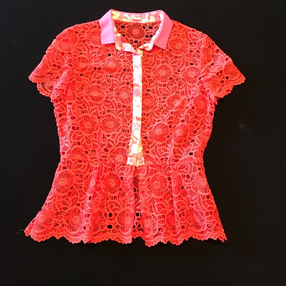 Coral lace short sleeve top with pink ribbon collar and silk floral details.