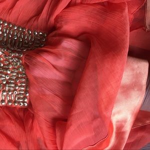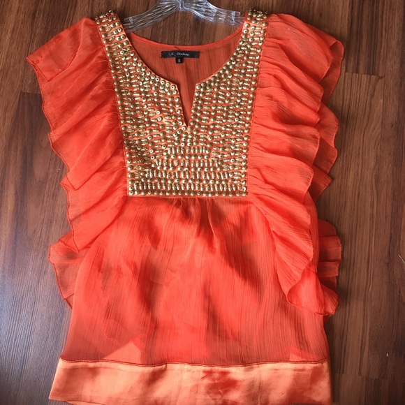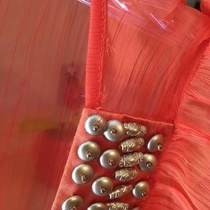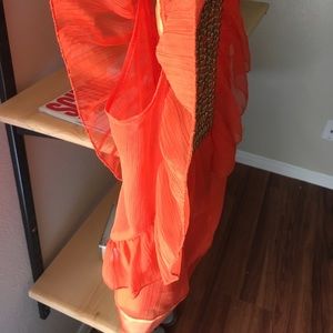 Bright orange and metallic gold detail, very different shape or cut, fresh for summer, 100% poliéster, very delicate and silk like fabric ribon on the bottom and back. Good condition just a few details shown in pictures. Love it but don't fin in anymore! 😬