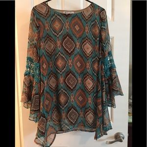 Can wear with leggings or jeans flowey shirt with flare sleeves teal and shades of brown. Excellent condition