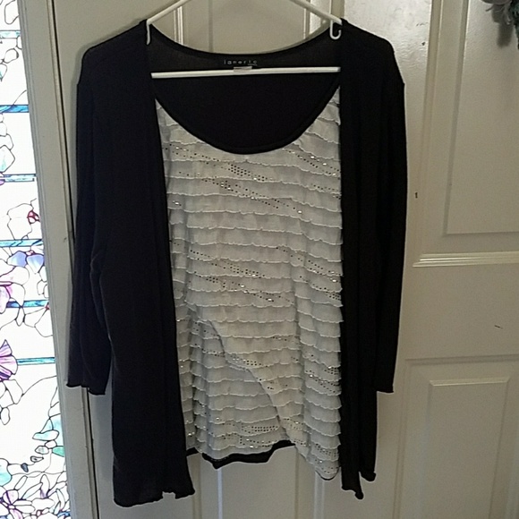 Brown sweater with faux tan ruffled tank underneath.