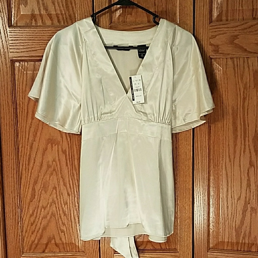 New York & co, off white, satiny feel/look, flutter sleeve, gathered bust detail and tie back.