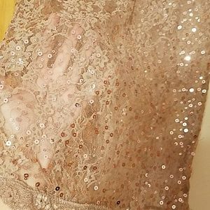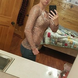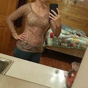 Like a rose gold color to it, Shimmery, very see through top (as seen) and suggest wearing cami underneath, worn a couple of times, still in great condition