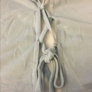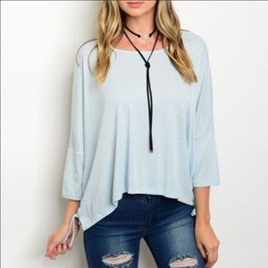 Tie on the side Tee. Oversize style tee. Color is baby blue. Size S. 15% linen & 85%polyester. Soft. New with tags. Smoke and pet free home. #30