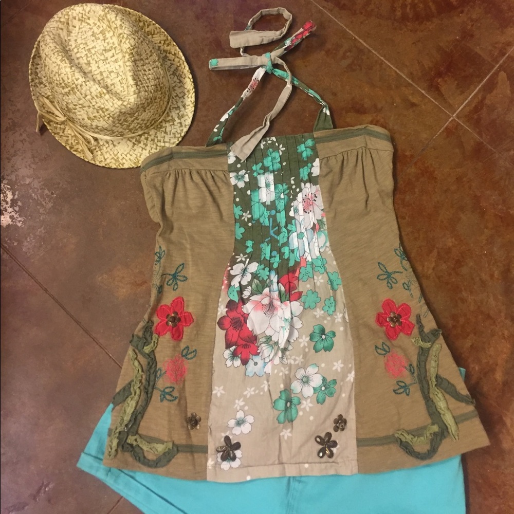 Tan floral halter, the detail on this is so cool! Very unique top! You could pair it with a jacket for Fall! Tag reads large but it runs small! More like a size meduim