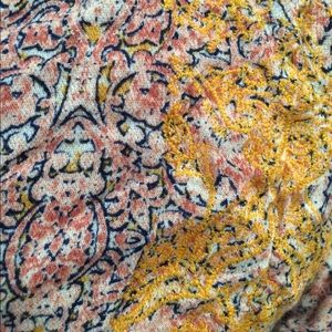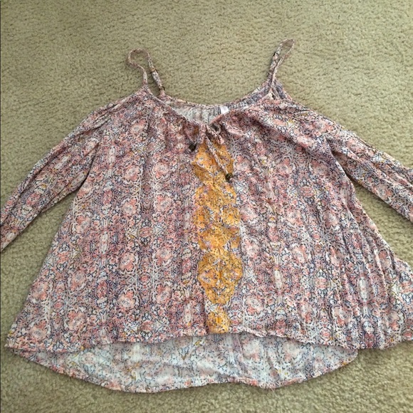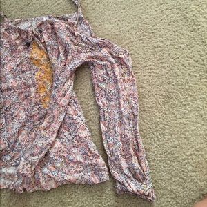has spaghetti straps and holes in between the straps and long sleeves, the end of the sleeves are scrunchy. It's a decently thin top with gold embroidered designs in the middle. good condition
