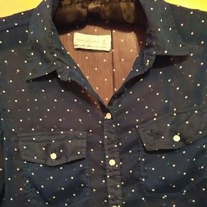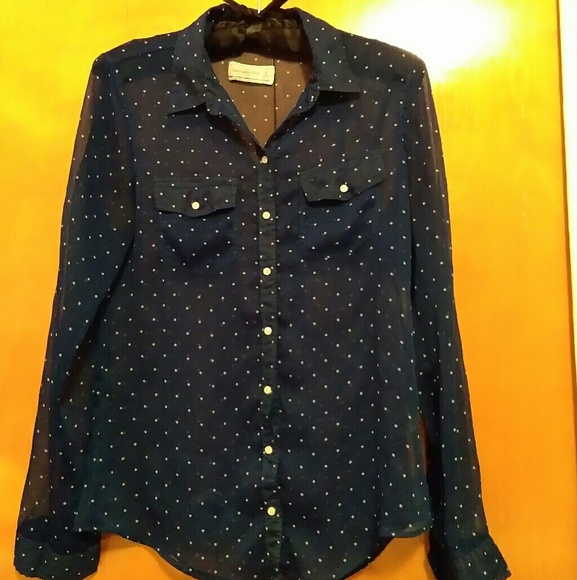Sheer top, dark blue with white dots, 26" long from shoulders.