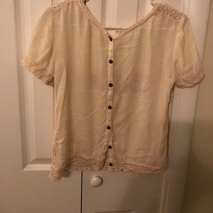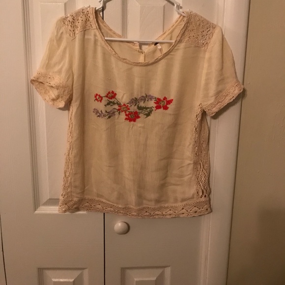 Short sleeve, buttons down the back with an embroidered pattern on the front.
