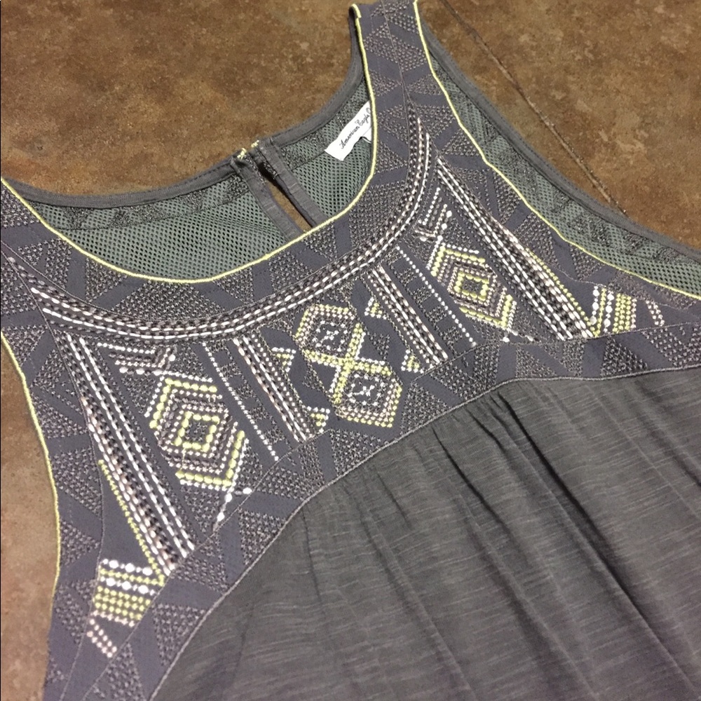 Gray Aztec embroidered Razorback top , non clingy, flowy & comfy... looks great with skinny jeans