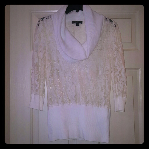 Flower pattern see through. Sweater like material at the bottom, around the top, and at the bottom of the sleeves