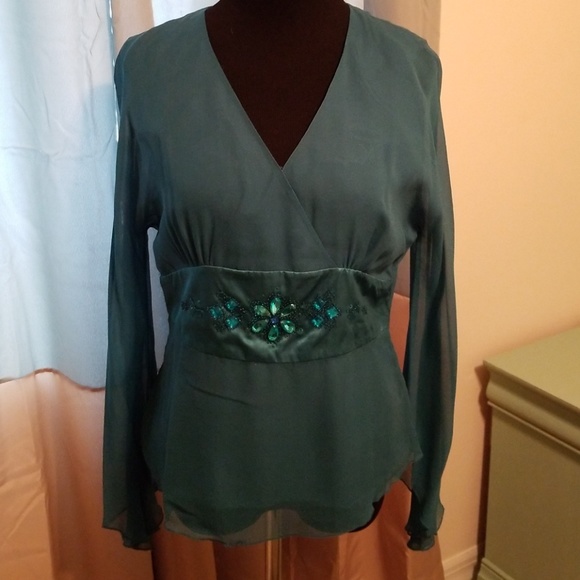 Green with sheer long sleeves. Flower embellishments. Side zipper