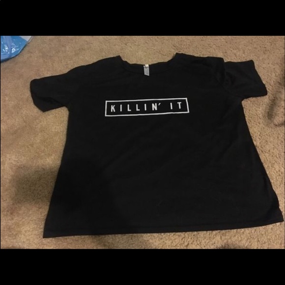 “Killin it” shirt. Could be worn as a crop top but I ordered it bigger so it fits as a normal T-shirt. Fits as a medium or large. Ordered it off amazon so the sizes are different
