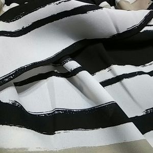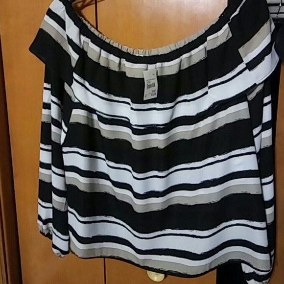 Sexy off-the-shoulder top, ruffled around neckline, black, tan, and white stripes, long sleeves w/elastic. NWT, NEVER WORN