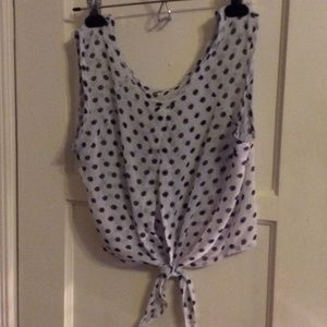 Black Splashed Polka Dot white top. Scoop neck, with daring slit tie up back. Sleeveless, sheer and cute.