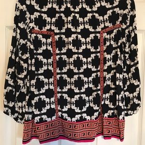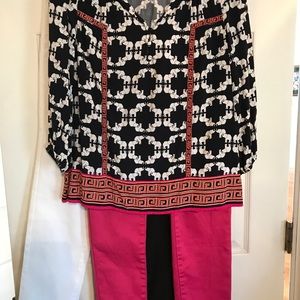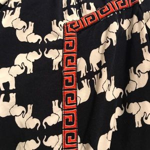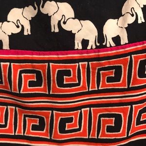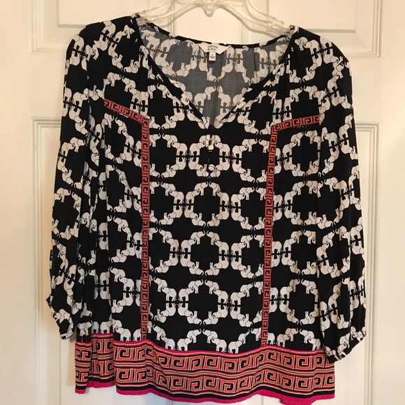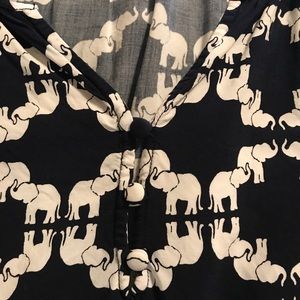 Beautiful navy, white elephants, orange and pink trim! Endless possibilities - wear with navy blue slacks or your favorite white or pink jeans!