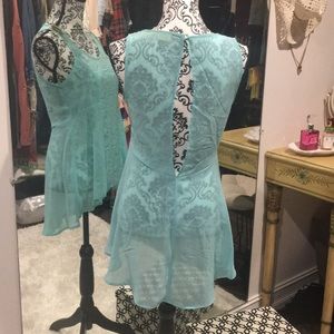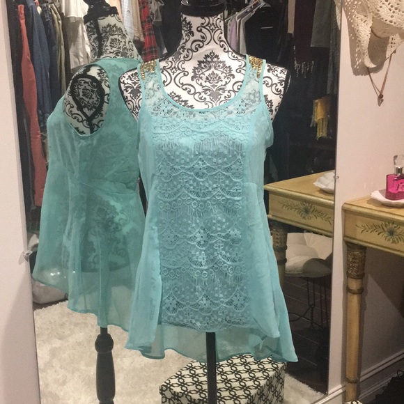 Sheep top to be worn over a camisole. Lace down the front, open back and gold accent pieces at the shoulders. Good condition. Aqua/Turquoise color.