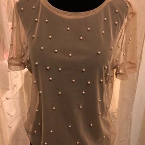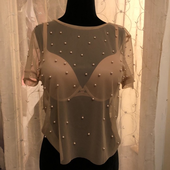 See through cream color shirt with pearl in front and back so pretty :)