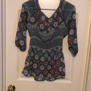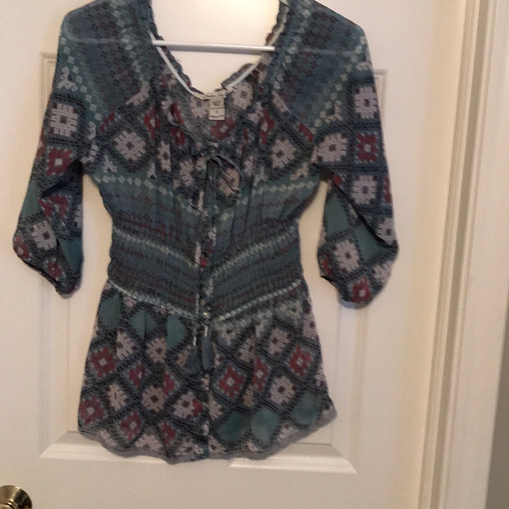 American rag Bohemian style elastic neck can be worn off shoulders sheer. Buttons down the front 4 inch elastic waist