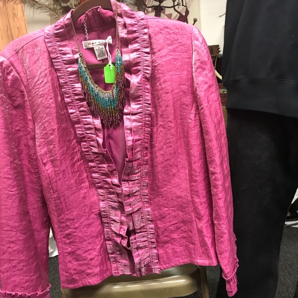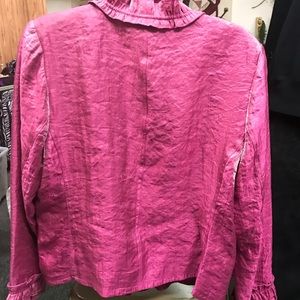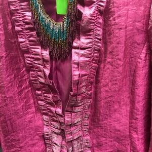 Bright pink blouse, beautiful fabric, ruffles, you will love this .made of rayon, nylon,polyester. Very dressy.