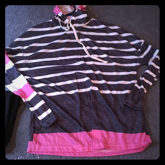 T-shirt material hoodie top. Super cute but never worn. Pink/ navy blue and white stripes