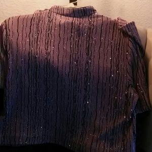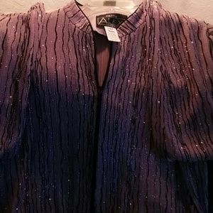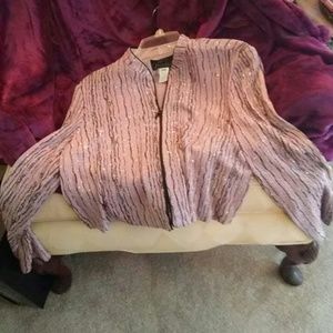 Tan sequin cocktail jacket with black stipes. Zipper front.