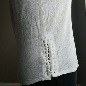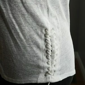 Completly see through white top by J Lo. Black cami under it not for sale. Has faux leather ties on both bottom sides. Gently used. True to size.