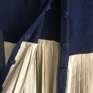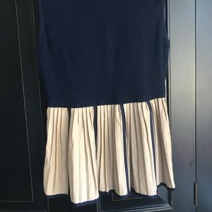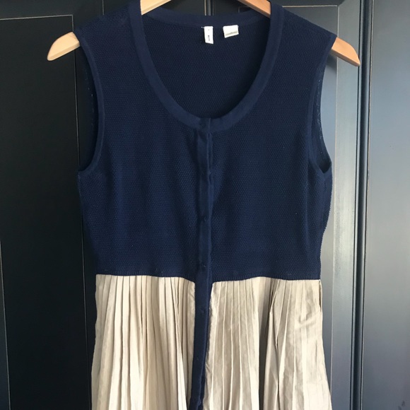 Stretchy beige and blue sleeveless, pleated top. Please know that I thought the piece was too wide when purchased so I had it tailored ( for the better). The front has snap buttons which become hidden - the top is like none other I’ve had. It sits just at the pant line and very feminine- great for play and work!