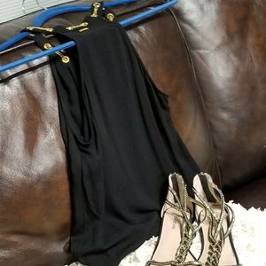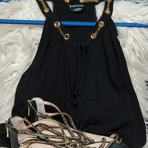 Black bebe top with slit in the front. Ties in the front with two black thin laces at the top. Gold colored accents. Worn a few times, in good condition without damage. 16 inches measured across.