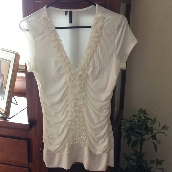 White shirt sleeve top with ruching. V-neck.