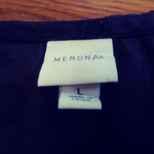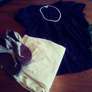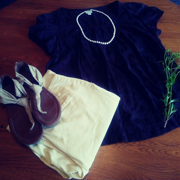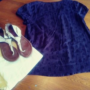 Capped sleeved, light Spring top. It looks blue in these pictures, but is chocolate brown. It is float and comfy.