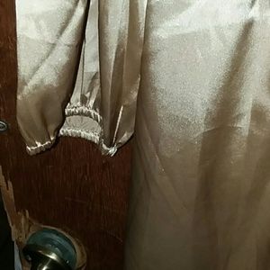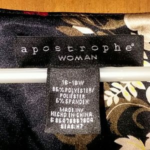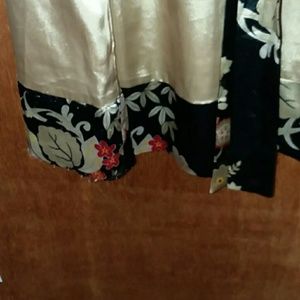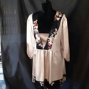 Silky champagne colored with black Oriental floral design, tie in back, elastic 3/4 sleeves, 95% polyester, 5% spandex. Machine wash. Looks very dressy with black pants.