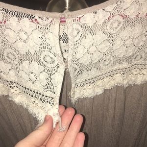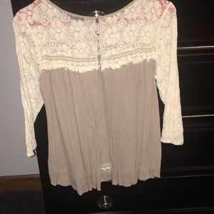 Cute blouse with lace and an open back. One of the loops on the back for the buttons is broken but it’s not even noticeable and can easily be fixed 😊