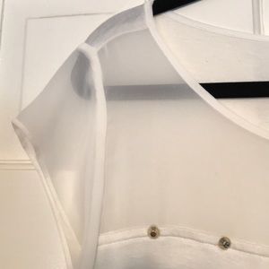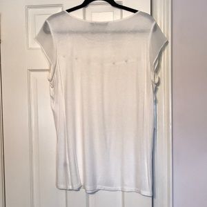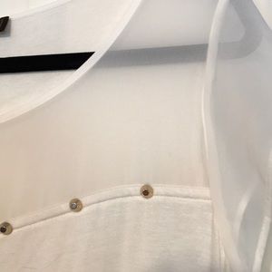 Jersey knit, cap sleeve top. The top of shirt is sheer, as well as the cap sleeves. The detail on the top is gold tone. Cream color.