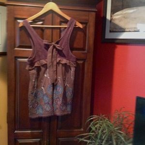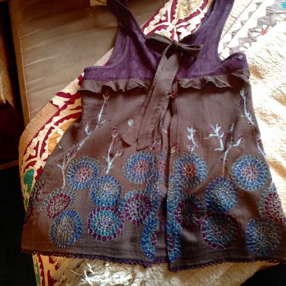 Fun summer top with open front! Needs a tank underneath! Whimsical floral embroidery with metallic silver! Bodice is dark purple lace!