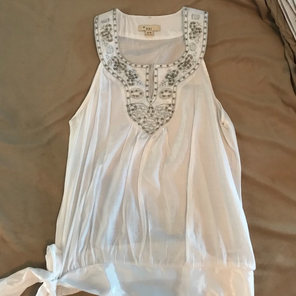 White, embroidered & studded. Has banded hem and ties at side.