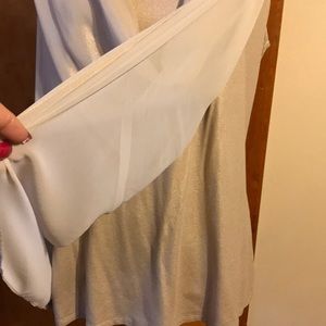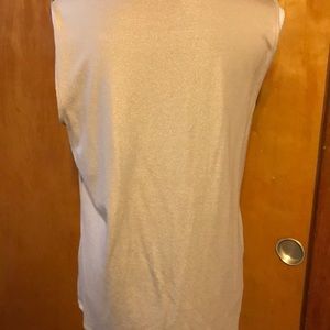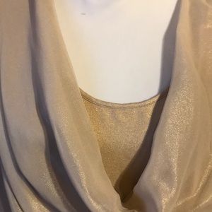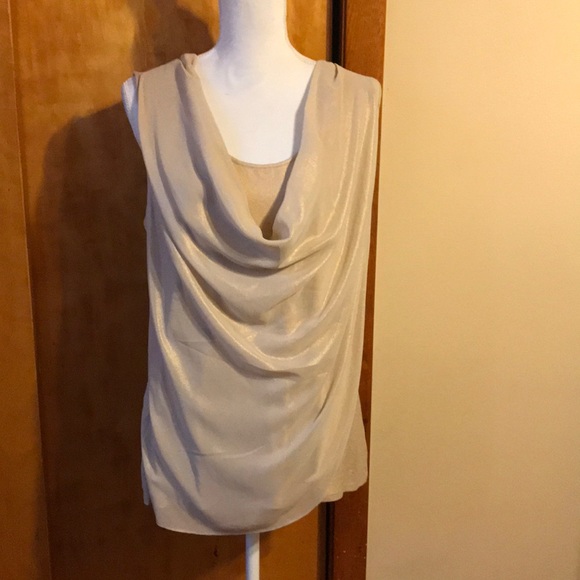 New York & Co. sleeveless top gold metallic can be dressed up or down. 95% rayon and 5% spandex. The overlay is 100% polyester. Never worn.