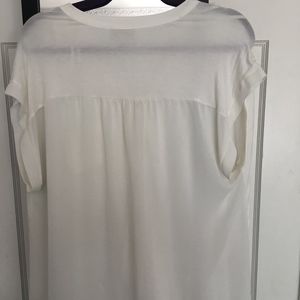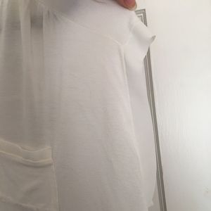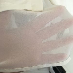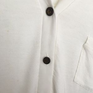 Cream button up shirt with brown buttons. Sheer back with pocket on side. Has some stains in the front but I'm sure a home ready will get them out.