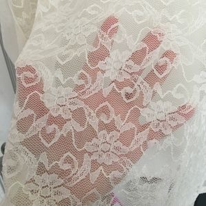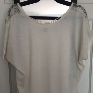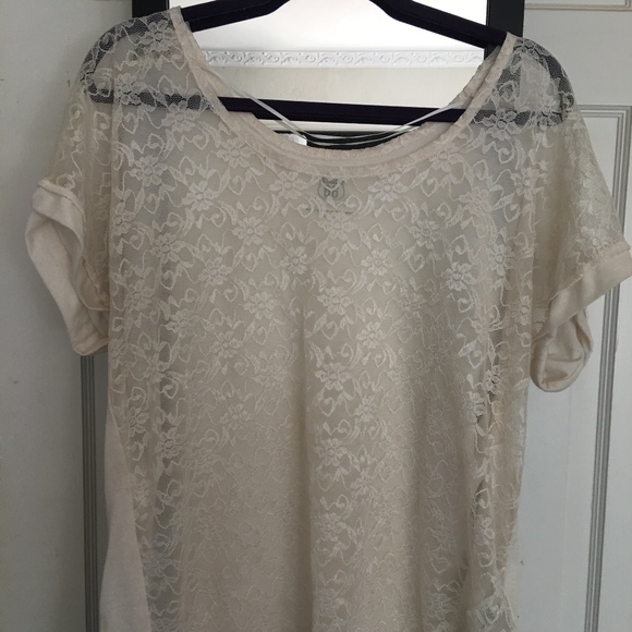 Cream shirt with lace on the front and round neck.