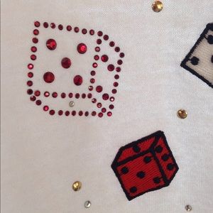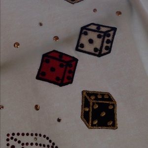 Cute white shirt made by Fruit of the Loom. Embellished with shiny dice and 7 . 11 for your high roller win! It's been around for a while but hasn't gotten much use. Some things you just can't let go of.