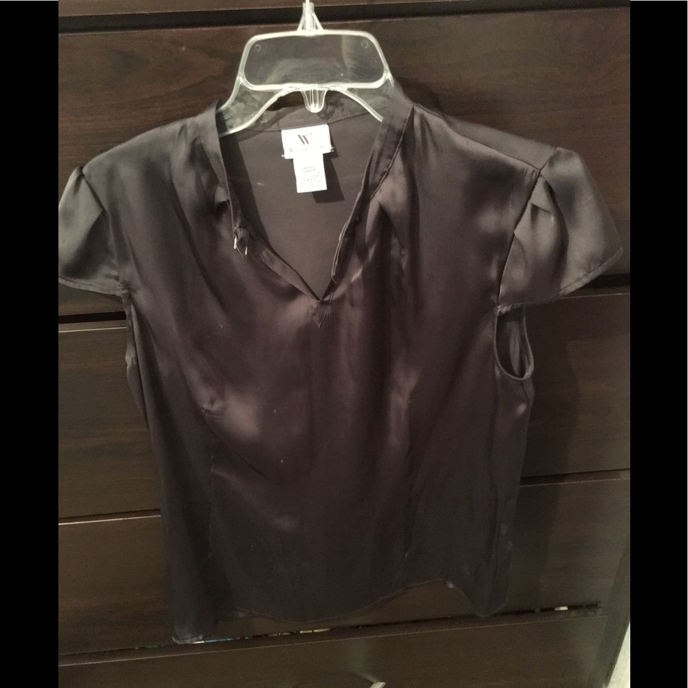 Charcoal gray silky top with buck accent at the neck. Can be worn buckled on unbuckled; cap sleeves.