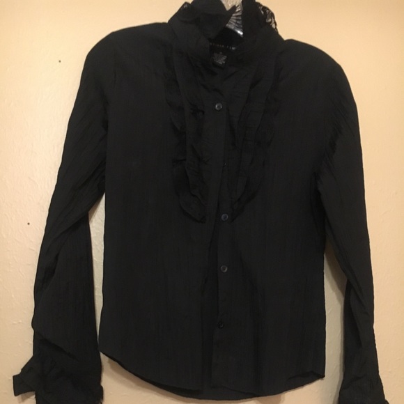 Black high collar ruffle shirt!! Super cute