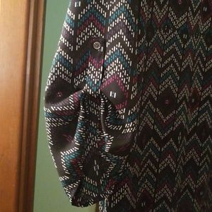 Maurice's black top with white, button up 3/4 sleeve, teal and magenta colors. Sz 4 (26/28), fits more like a 22/24 if you're busty. Never worn, Brand new, NO tags.