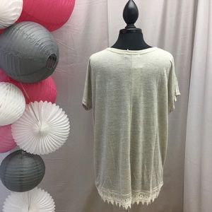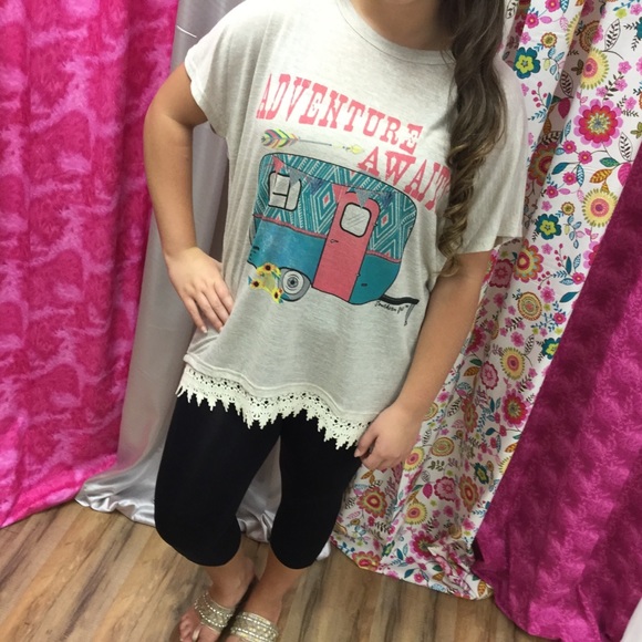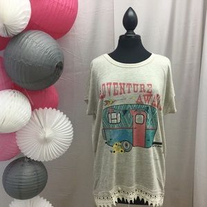 Cute camper T-shirt with crocheted lace trim around the bottom
