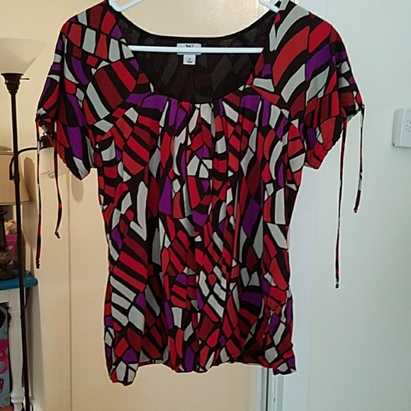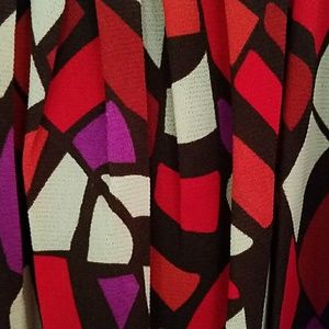 Black, beige, red and purple, sleeves ties on the ends. 22" length