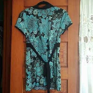 Very pretty turquoise color. Ties in the back. It is super cute on. Soft & comfortable but still dressy enough to wear out. Excellent condition besides its missing the size tag...I would say best fit for a size Medium.