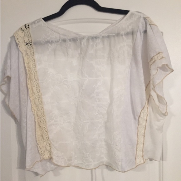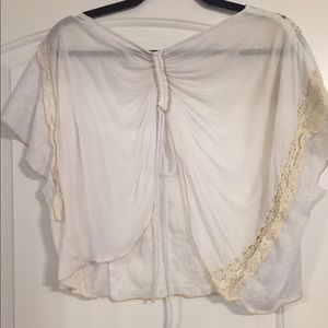 Sweet White Short-Sleeve Top with lace and cross stitching detail. Adjustable draw string in back to raise or drop the back depending on how much coverage you’d like. So soft!