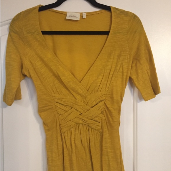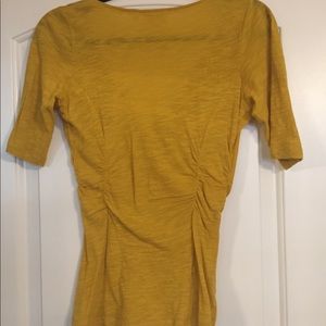 Yellow/Gold Short-Sleeve Top. Deep V with lattice Work details. Very flattering.