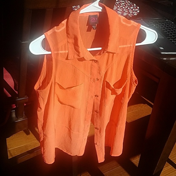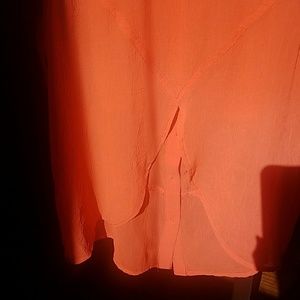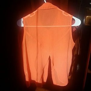 Like new, 100% polyester, sheer, split-back top with brass buttons. Two high pockets. Non-smoking, no pet home.