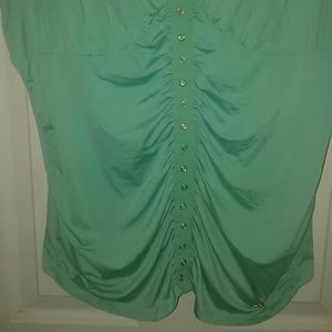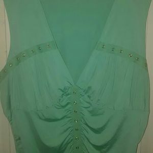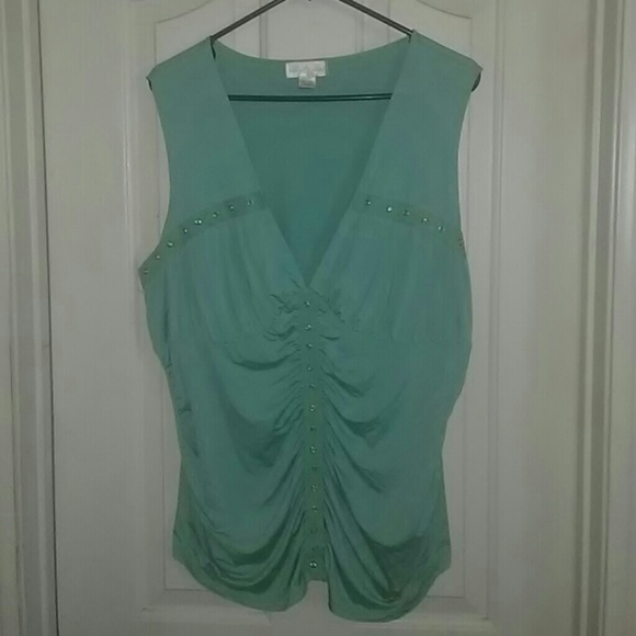 V-neck sleeveless top with ruche and rhinestone accents.