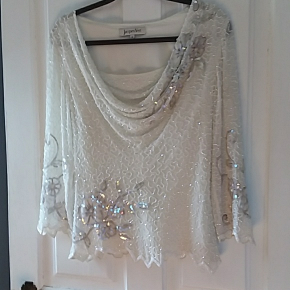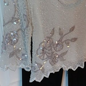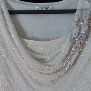 Beautiful beaded top in cream and gray. Worn one time to a wedding. Dry cleaned and ready to go. It has a tag that states it is a 10. I am a six and it fit well. just like all wedding the size is off.