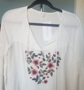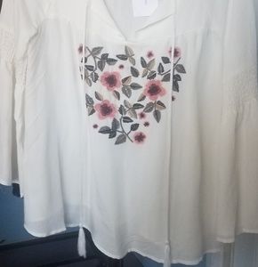 Bell sleeve boho top, embroidered flowers with a working tie